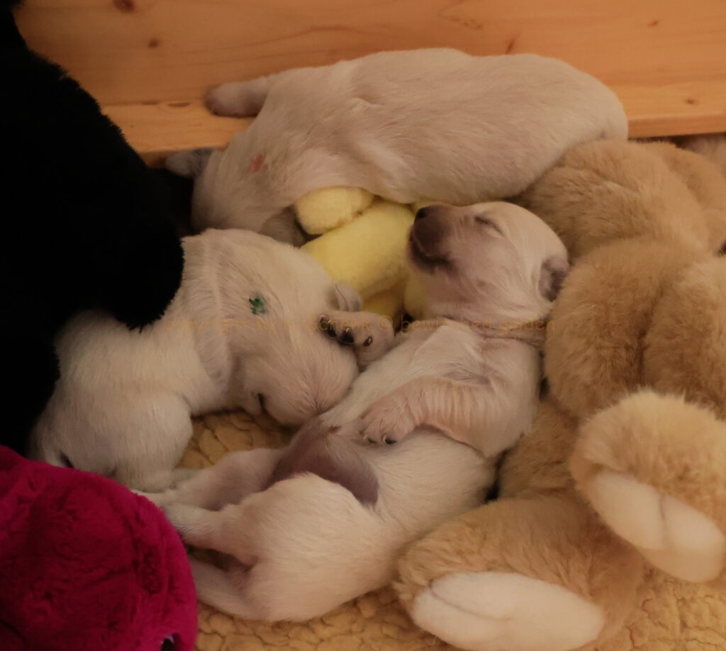 … sind immer diejenigen, an denen wir staunend vor der Wurfkiste sitzen und beobachten, zu welchen Wundern die Natur fähig ist. Die kleinen D-chen finden schon selbstständig Mamas Zitzen und saugen sich zuverlässig daran fest. Noch gibt es nur wenig Unmut beim Andocken an die Milchbar, alle finden irgendwann ein Plätzchen.