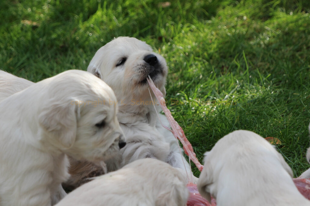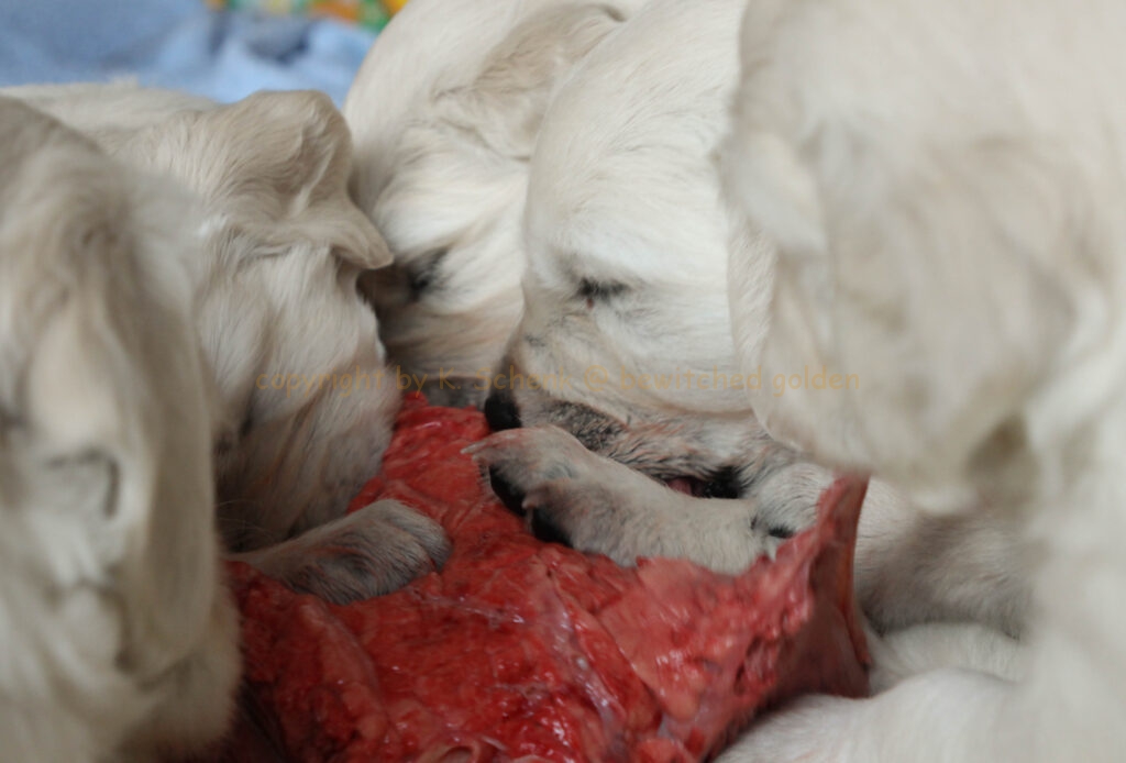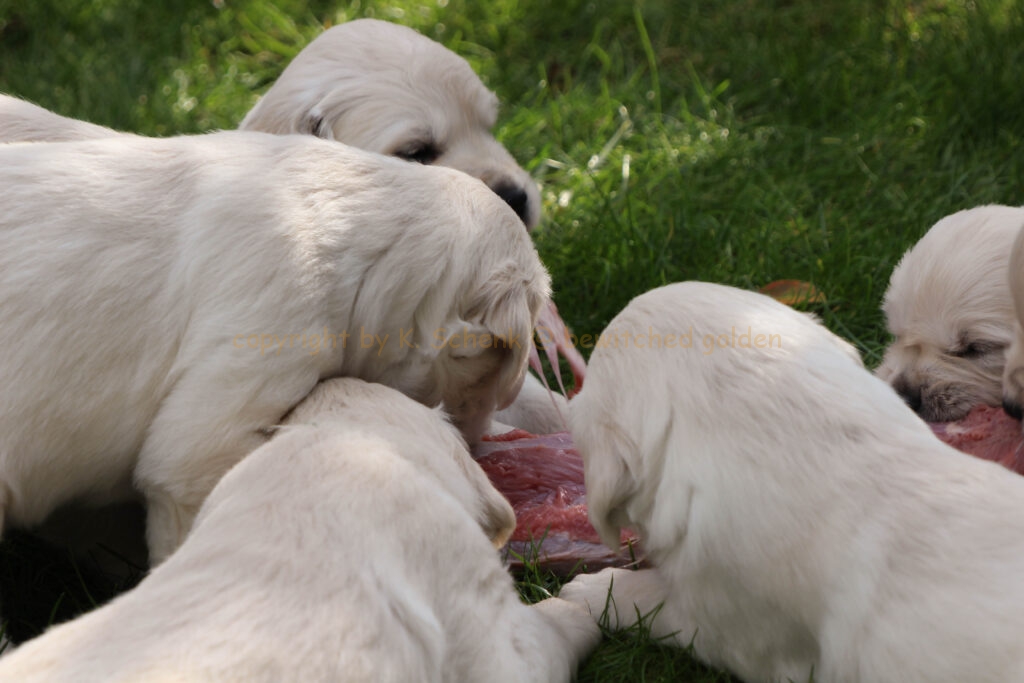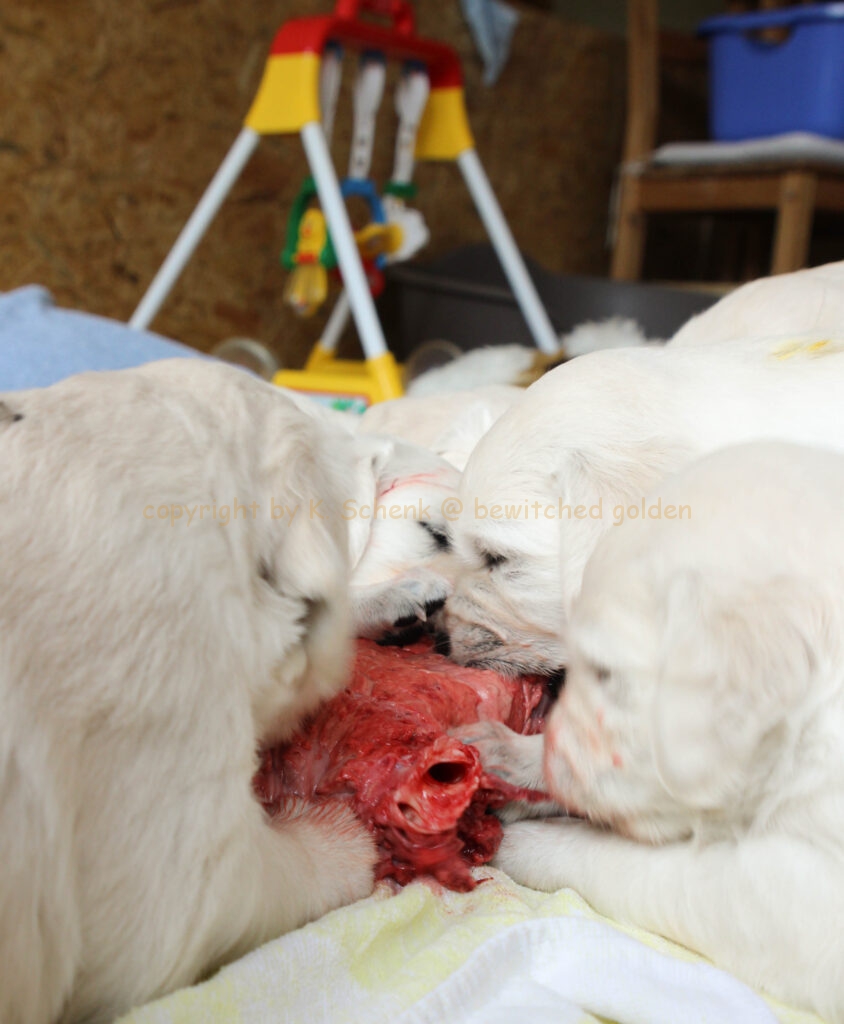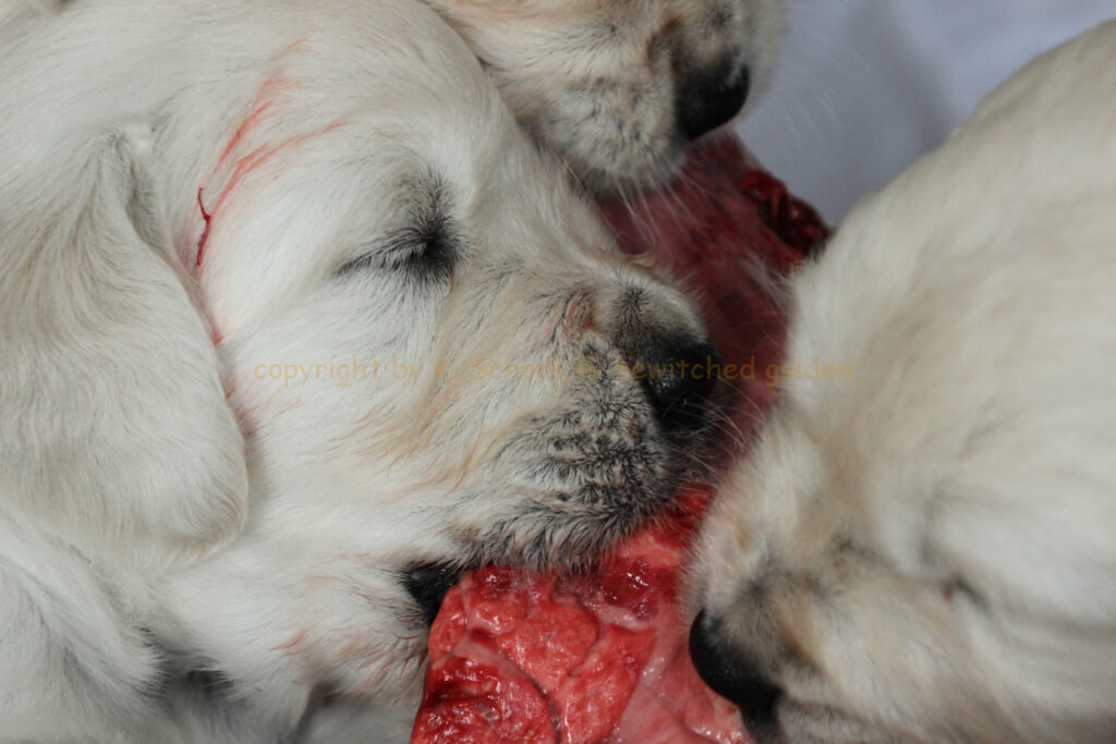 Unsere Welpen werden gebarft. Das bedeutet, es gibt auch gleich mal ein Stück Rindfleisch für alle! In einer weiteren Runde gibt es dann ein großes Stück frischen Pansen… wohl dem, dessen Näschen nicht ganz so empfindlich ist! 🙂