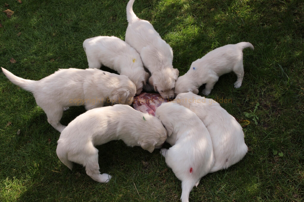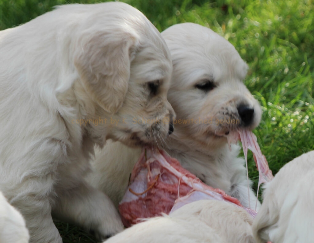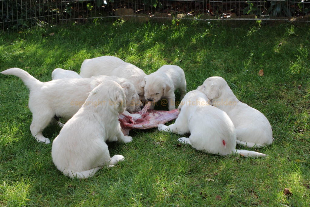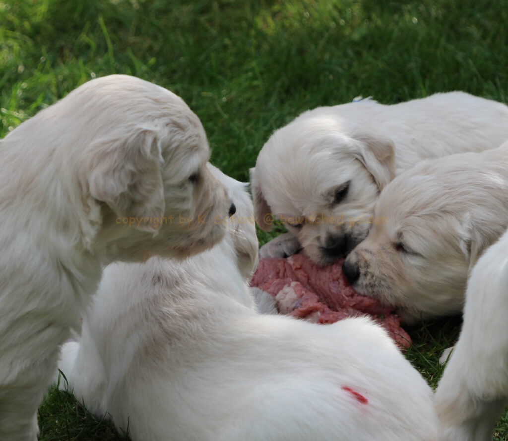 Unsere Welpen werden gebarft. Das bedeutet, es gibt auch gleich mal ein Stück Rindfleisch für alle! In einer weiteren Runde gibt es dann ein großes Stück frischen Pansen… wohl dem, dessen Näschen nicht ganz so empfindlich ist! 🙂