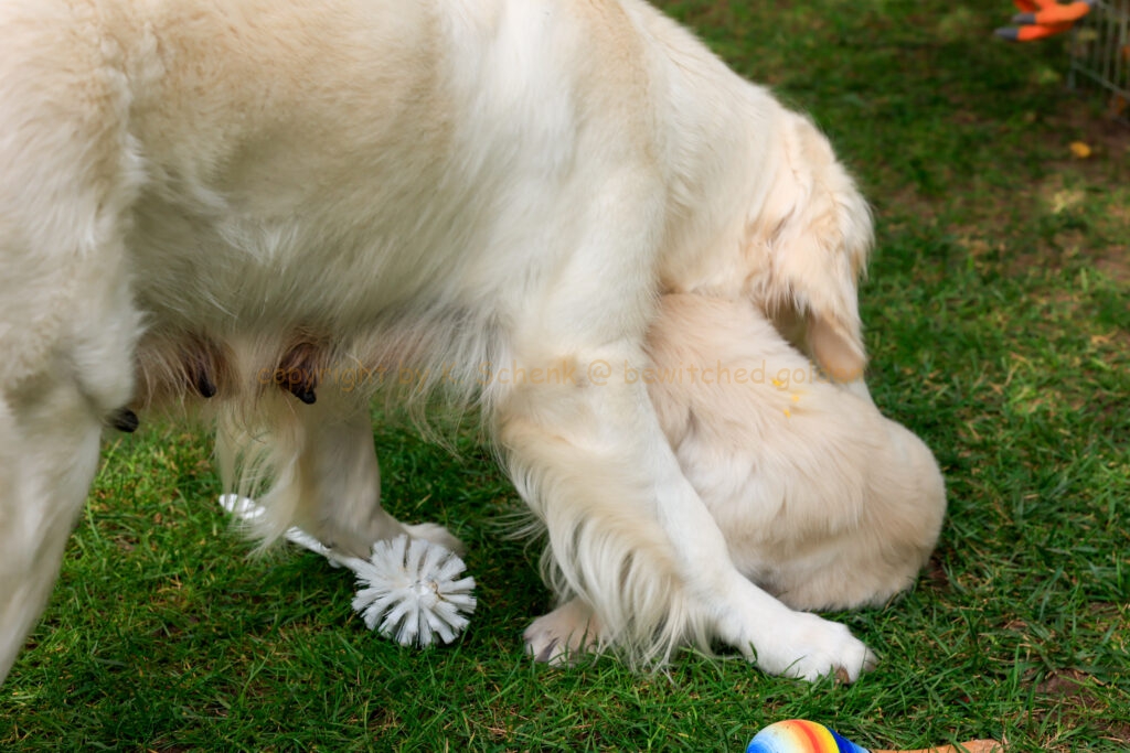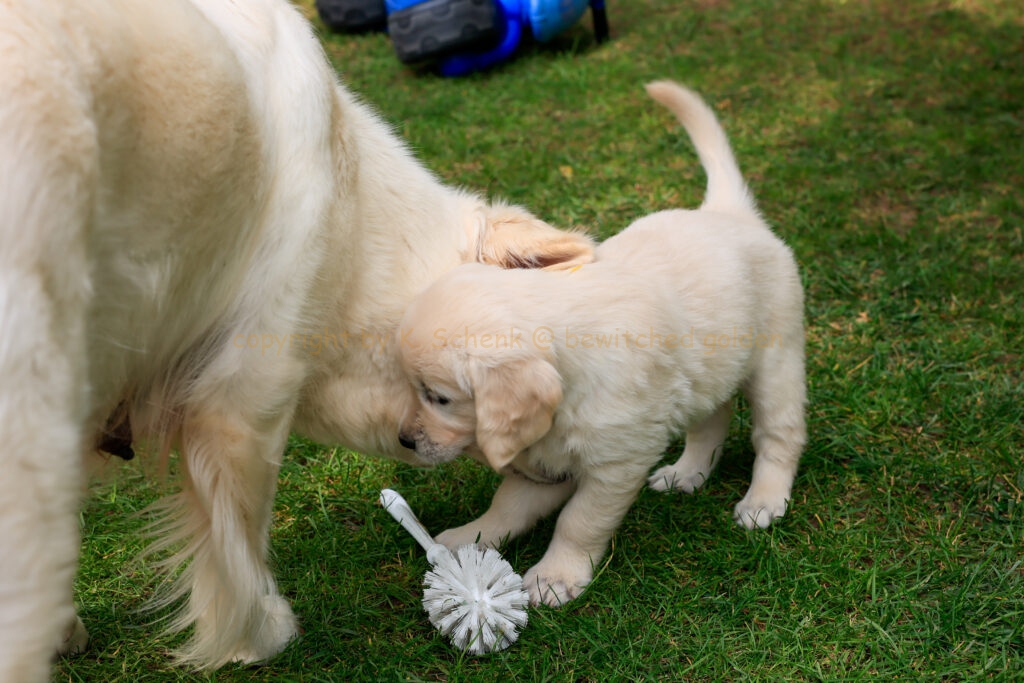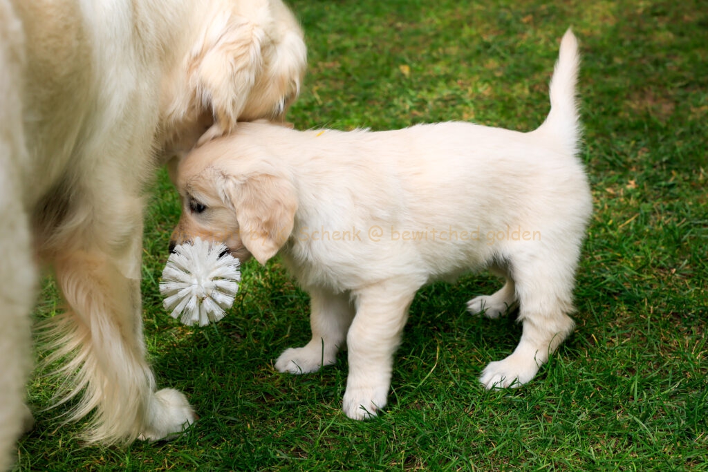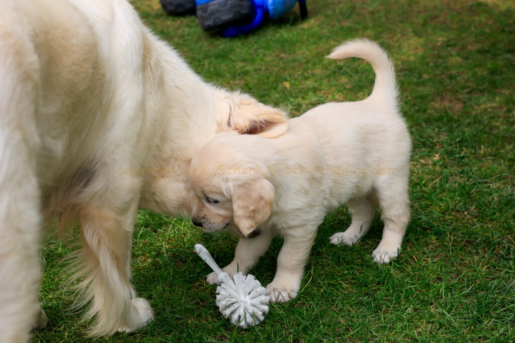 Molly spielt gerne mit ihren Kindern – die Klobürste war schon in ihrer Welpenzeit ihr Lieblingsspielzeug, also ist es kein Wunder, dass sie da natürlich voll ins Spiel einsteigt, wenn eines ihrer Kinder damit ankommt. 🙂